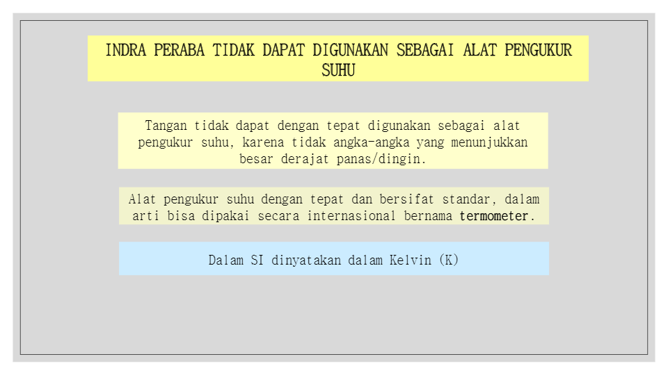 Dan tuang air hangat ke dalam ember c Oleh karena itulah, kita tidak dapat mengukur suhu benda menggunakan indra peraba. Maksudnya adalah indra peraba kita (kulit ) mampu merasakan suhu suatu benda tapi dengan suatu keterbatasan dalam menentukan suhu. Ini karena suhu yang dirasakan tanganmu bergantung pada suhu yang diraba tangan sebelumnya. Untuk dapat mengukur suhu suatu benda dengan tepat, kita menggunakan alat ukur yang disebut termometer. (a) besaran pokok adalah besaran yang satuannya telah ditetapkan terlebih dahulu, dan besaran ini tidak diturunkan dari besaran lain. Pada kulit terdapat sebuah reseptor yang peka terhadap sebuah rangsangan fisik (mekanoreseptor). Energi panas merupakan salah satu energi yang dapat diterima dan dilepaskan oleh suatu benda. Peserta didik mamapu menggunakan termometer untuk mengukur suhu zat. Nah, dalam ilmu pengetahuan alam untuk menyatakan tingkat panas dinginnya suatu keadaan digunakan suatu besaran yang disebut suhu atau temperatur. Hasil pengukurannya bersifat kualitatif 3. Peserta didik mampu mengemukakan alasan mengapa indra peraba tidak dapat digunakan sebagai alat pengukur suhu. indra peraba dapat merasakan panas, hangat, dan dingin, tetapi indra peraba tidak dapat menentukan angka derajat pada suhu.